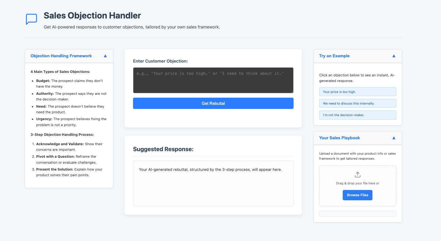 The Sales Objection Handler leverages the power of the Google Gemini API to deliver expert-level rebuttals tailored to your specific sales framework. By simply entering a customer's objection, a salesperson receives an instant, structured response built on a proven three-step process: