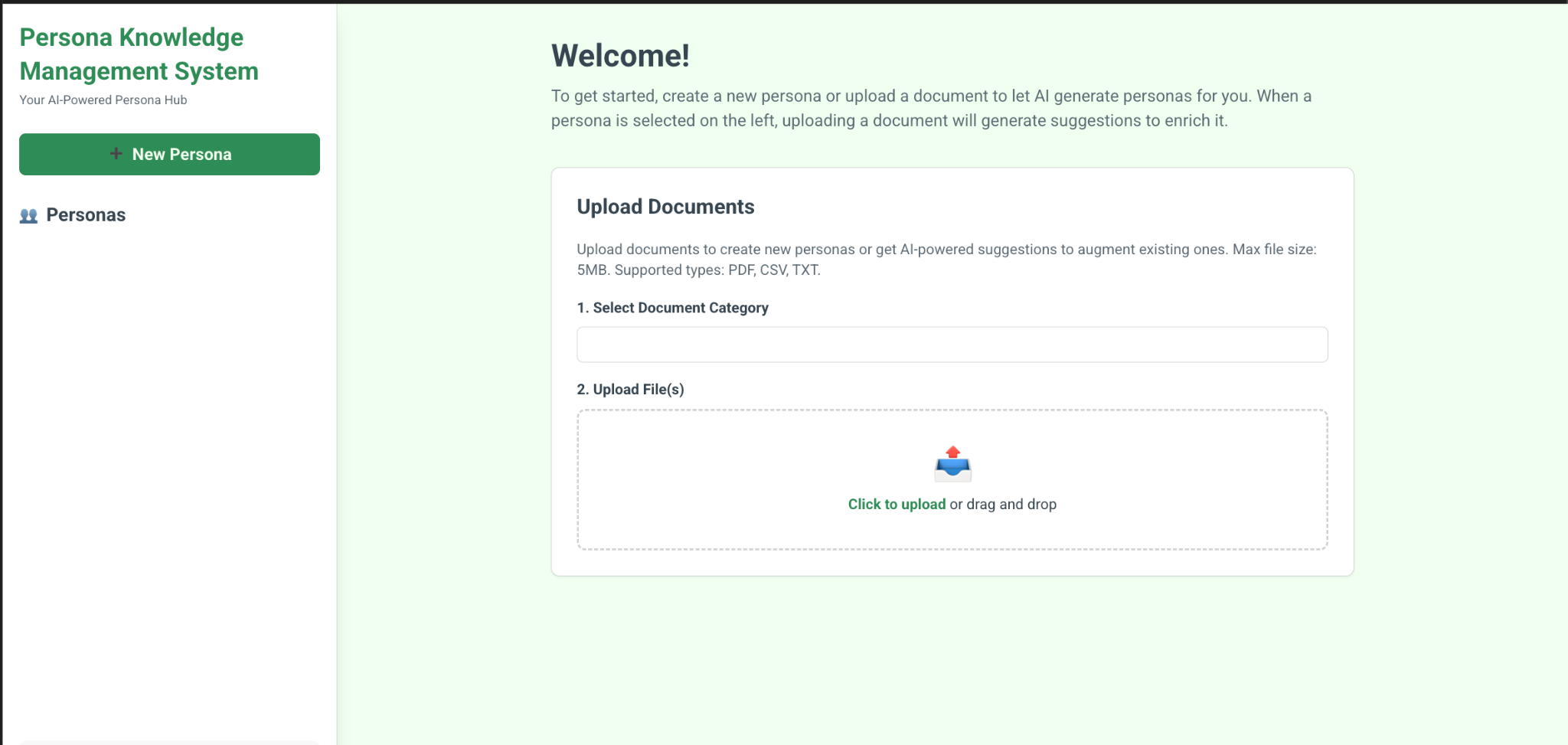This application streamlines and automates the entire persona creation lifecycle. It leverages the Google Gemini API to analyze your uploaded documents, intelligently identify potential customer personas, and extract a rich set of structured data for each one. The result is a central workspace where your team can manage, refine, and augment personas with new information, ensuring your knowledge base is always up-to-date, consistent, and actionable.