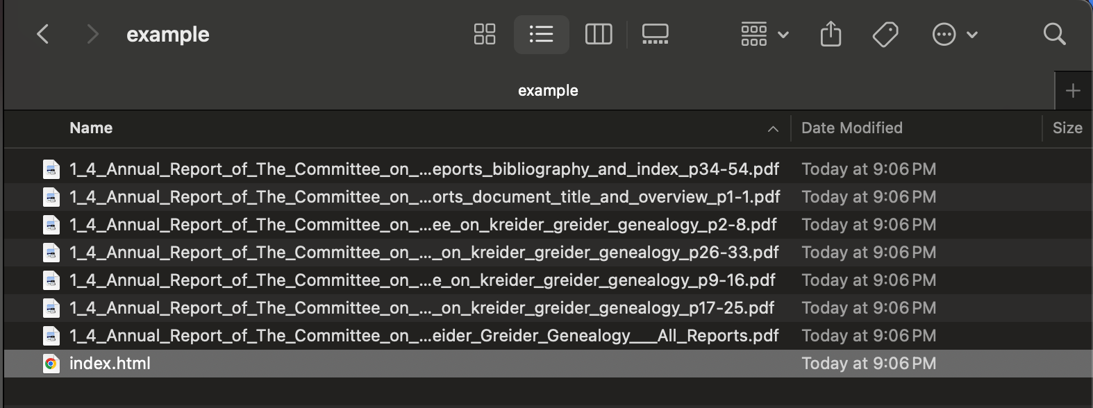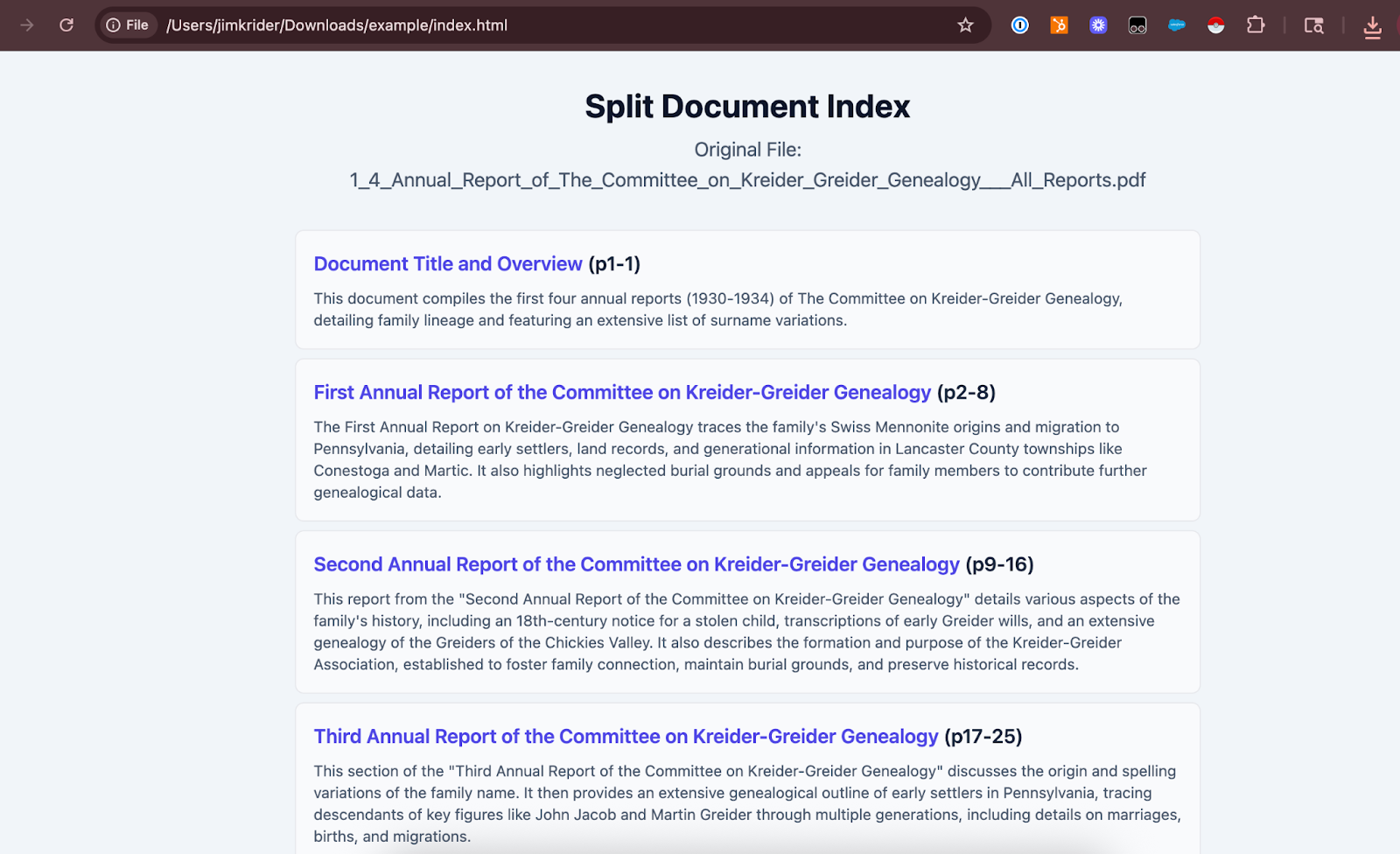 Finally, the app generates a comprehensive ZIP package containing the original document, all the individually split PDFs, and a master index.html file. This index serves as a clickable, summarized table of contents, allowing you to instantly navigate to the exact section you need.