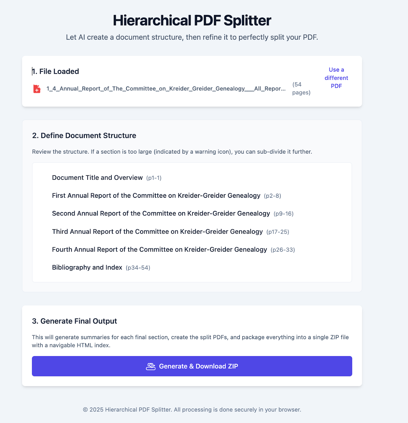 The Hierarchical PDF Splitter automates this entire workflow. The application uses AI to analyze a document's content and propose an initial, logical structure based on chapters or thematic shifts. Users can then review this structure and interactively sub-divide any section that is too large, creating a nested, tree-like organization that perfectly matches their needs.