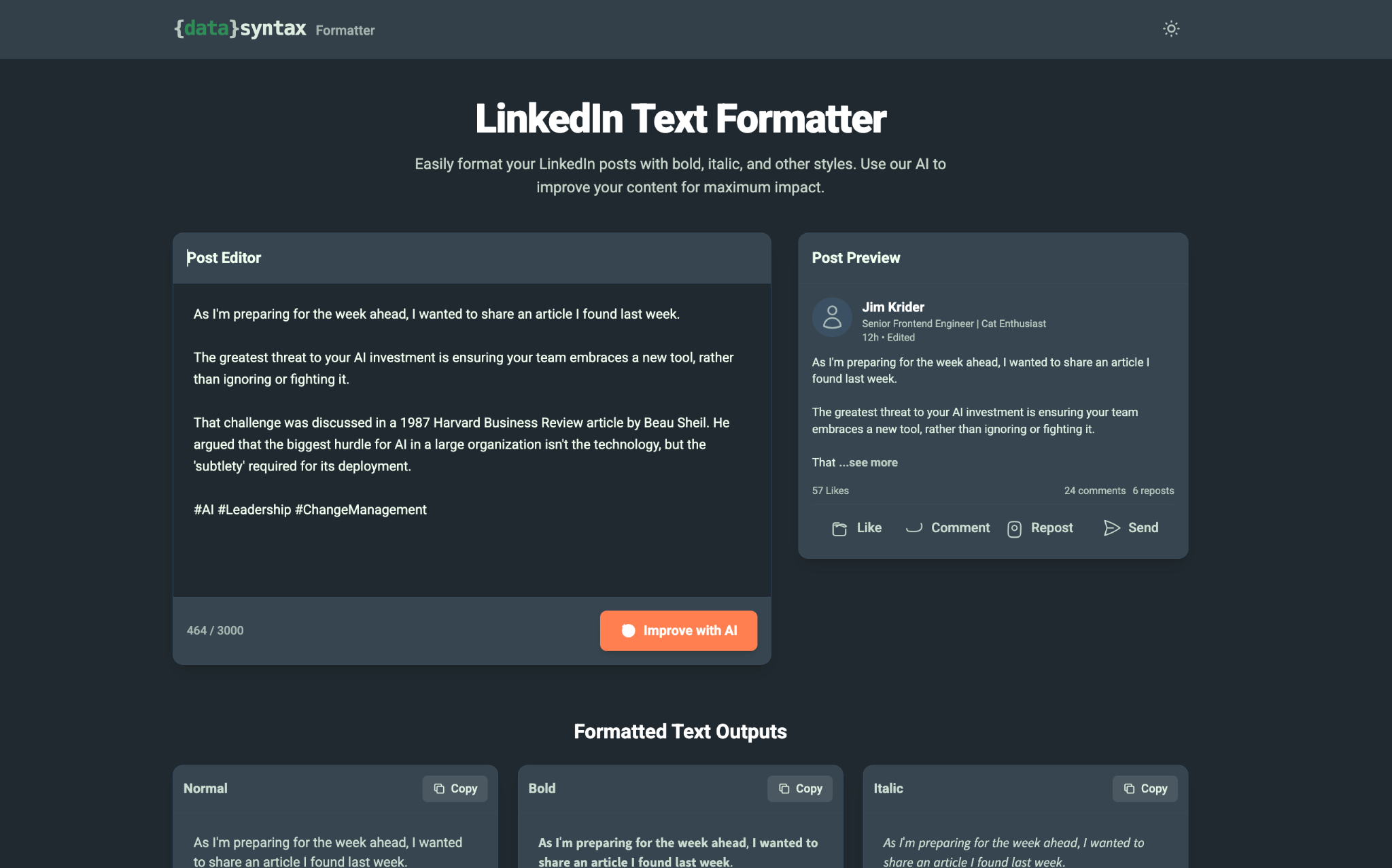 The DataSyntax Formatter provides a simple interface to instantly apply various text styles (e.g., bold, italic, script) to make your LinkedIn posts more scannable and professional. The application uses Unicode character mapping for instant, client-side formatting.